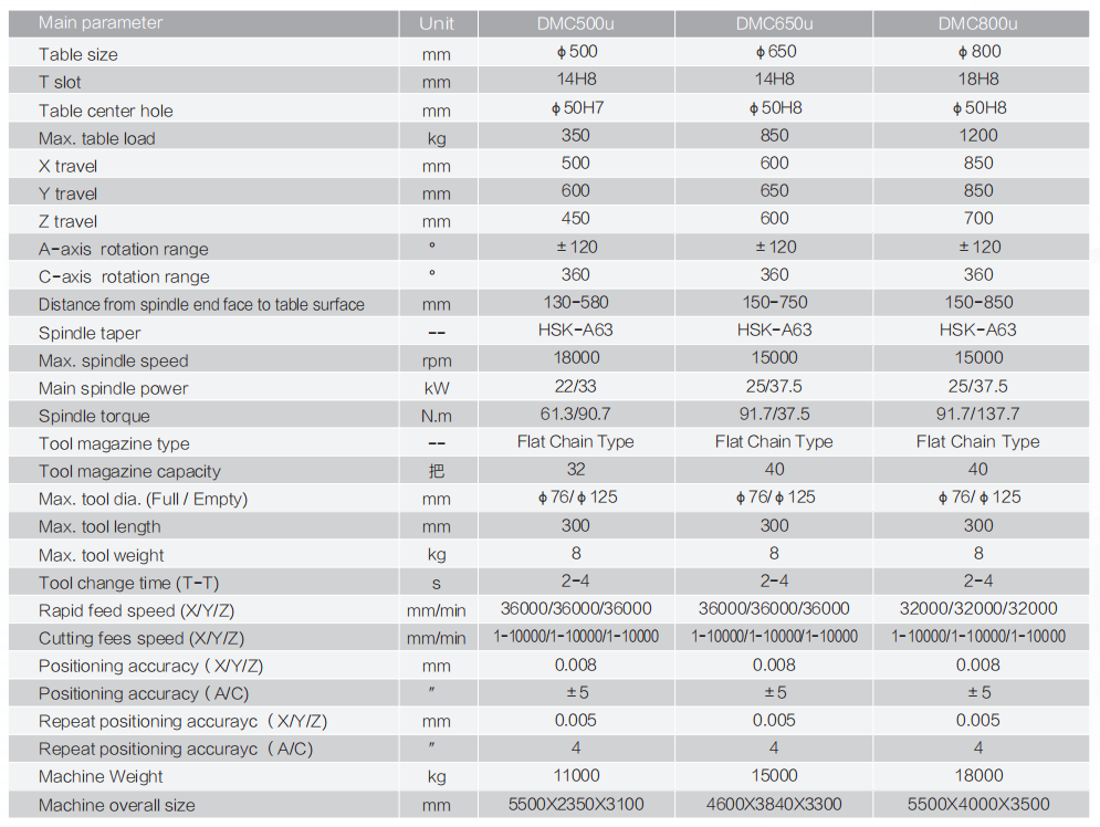 Highly reliable and efficient drive positioning system 1.X, Y, Z are connected to high-precision ball screw through backlash-free elastic coupling , to ensure the positioning accuracy of the machine tools 2.X and Z axis adopts Taiwan HIWIN 45mm wide roller linear guideway, Y axis adopts 4pcs 55mm roller linear guideway to improve transmission rigidity. 3.The rotary axes A and C are equipped with high torque motors, which optimizes the rotary accuracy of the whole machine. The table load capacity is up to 1200kg, with large processing range. 4. The working table has a large swing range of ±120 °, and can process 30 ° bottom cutting processing. 5.Configured with high torque and high speed electric spindle, with wide range of speed change; constant temperature water circulation cooling method ensures the stability of spindle rotary precision.