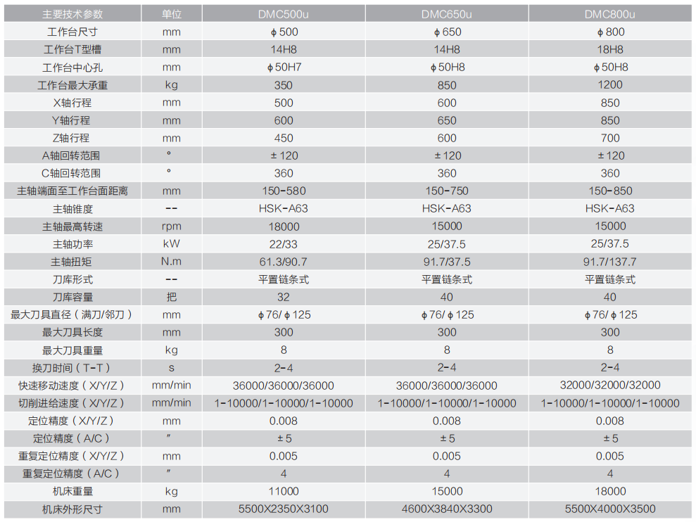 高可靠性、高效率的傳動(dòng)定位系統(tǒng): 1、X、Y、Z三軸均通過(guò)進(jìn)口無(wú)間隙彈性聯(lián)軸器連接高精度滾珠絲杠形式,保證機(jī)床的定位精度。 2、X、Z軸采用臺(tái)灣上銀45mm寬滾柱直線導(dǎo)軌,Y軸采用55mm寬四副滾柱直線導(dǎo)軌,提高傳動(dòng)剛度。 3、回轉(zhuǎn)A、C軸配置大扭矩力矩電機(jī),優(yōu)化了整機(jī)回轉(zhuǎn)精度。工作臺(tái)承重可達(dá)1200kg,加工范圍大。 4、回轉(zhuǎn)擺動(dòng)工作臺(tái)擺動(dòng)范圍大,達(dá)±120°,能加工30°底切加工。 5、配置大扭矩高轉(zhuǎn)速電主軸,變速范圍寬;恒溫水循環(huán)冷卻方式,確保主軸回轉(zhuǎn)精度的穩(wěn)定性。